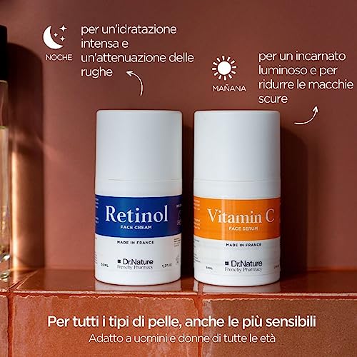 Set Skincare Viso 100 ML - Siero Vitamina C Anti Macchie e Crema Notte Viso Antirughe Retinolo - Set 2 Creme Anti Eta per Uomo e Donna - Contro le Macchie e le Rughe per Pelle Sensibile