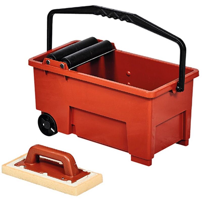 SKIPPER 242C/SWE4 Kit vaschetta lavaggio con frattazzo spugna Sweepex. Ideale per eliminare l'eccesso di prodotto sigillante nella fase di sigillatura di pavimenti e rivestimenti. CARATTERISTICHE Vasca in plastica antiurto. Due rulli in plastica su boccole antiusura. L'alta capacità della vasca (13 lt) non richiede frequenti cambi d'acqua. La spugna “Sweepex” ad altissimo assorbimento garantisce una pulizia perfetta. Corredo: frattazzo spugna “Sweepex” con impugnatura, griglia, manico trasporto, ruote Ø 80 mm (Ø 3 1/8”).