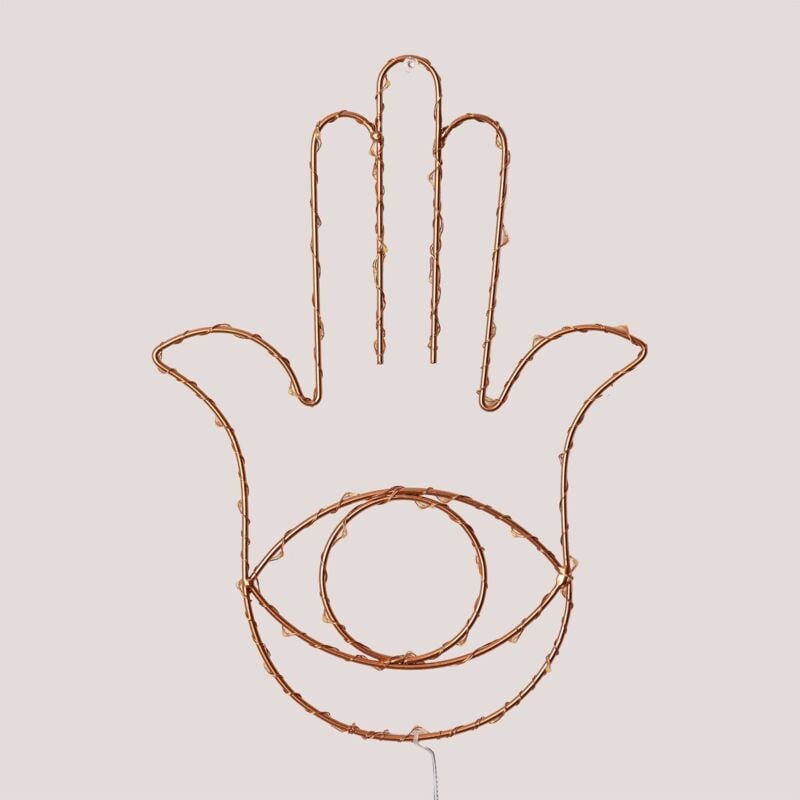 Completa ogni angolo della tua casa in modo originale con la nostra figura decorativa Yamsa con luci a LED . Perfetto per ottenere un'illuminazione decorativa, tenue e soffusa, e senza sovraccaricare, creando un'atmosfera più calda e accogliente. Con il suo disegno fa riferimento a un simbolo di protezione e attrazione per la buona fortuna, popolare in tutto il Medio Oriente e il Nord Africa che porta un tocco esclusivo e boho alla stanza. È per interni, con struttura in rame color oro ricoperta di luci led dai toni caldi. Per una corretta manutenzione è sufficiente pulire la polvere con uno spolverino o un panno morbido. Non tentare di pulire le luci mentre sono collegate . Dimensioni: 30 cm x 22 cm x 3 cm IMPORTANTE: Il servizio standard porta a porta non include la consegna e il ritiro della merce a casa del cliente, che è responsabilità del cliente. È possibile che la persona che effettua la consegna assista volontariamente alla consegna della merce (questo è completamente