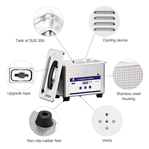 PULIZIA POTENTE: Potenza ad ultrasuoni 35W, 40000 Hz Le onde ultrasoniche producono milioni di microscopiche bolle di pulizia che rimuovono delicatamente lo sporco e la sporcizia senza danneggiare i prodotti. Alimentazione CA 220-240 V con spina europea.