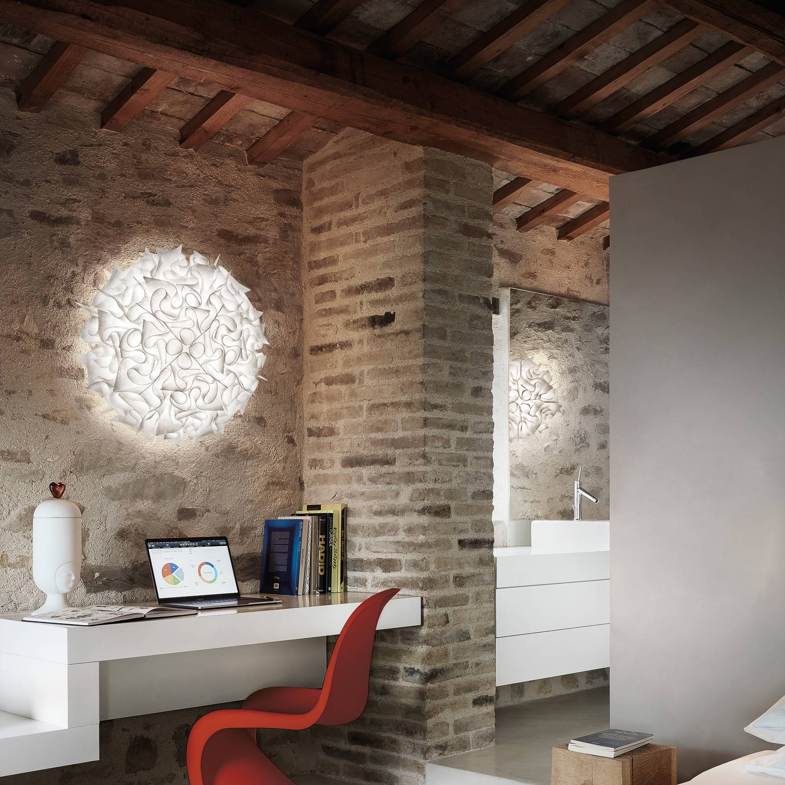 Lampada da soffitto decorativa di design Veli Couture Medium Contrariamente al suo aspetto, che fa sembrare la lampada realizzata in tessuto pregiato, il paralume di questa esclusiva lampada da soffitto di design Veli Couture Medium è realizzato in plastica di alta qualità, appositamente sviluppata e brevettata dal produttore Slamp. Questo materiale, chiamato Lentiflex®, rende l'apparecchio un'incantevole fonte di luce grazie al suo particolarissimo effetto luminoso, che può essere utilizzato su soffitti o pareti e dispiega il suo effetto unico in spazi abitativi privati così come in hotel, ristoranti, ecc. Nelle due prese dietro il grandioso paralume si possono inserire solo lampade a LED (E27 max. 12 W). Per valorizzare al meglio il paralume fatto a mano, il produttore raccomanda l'uso di lampade LED con ottica a filamento. Il design della lampada da soffitto Veli Couture è opera di Adriano Rachele, produttore della rinomata azienda di illuminazione Slamp con sede a Roma. L'azienda italiana produce creazioni illuminotecniche di alta qualità a partire da materiali naturali come pelle, metalli e plastica, che sono stati sviluppati e brevettati da Slamp e rendono possibili creazioni illuminotecniche molto particolari grazie alle loro proprietà in combinazione con la luce.