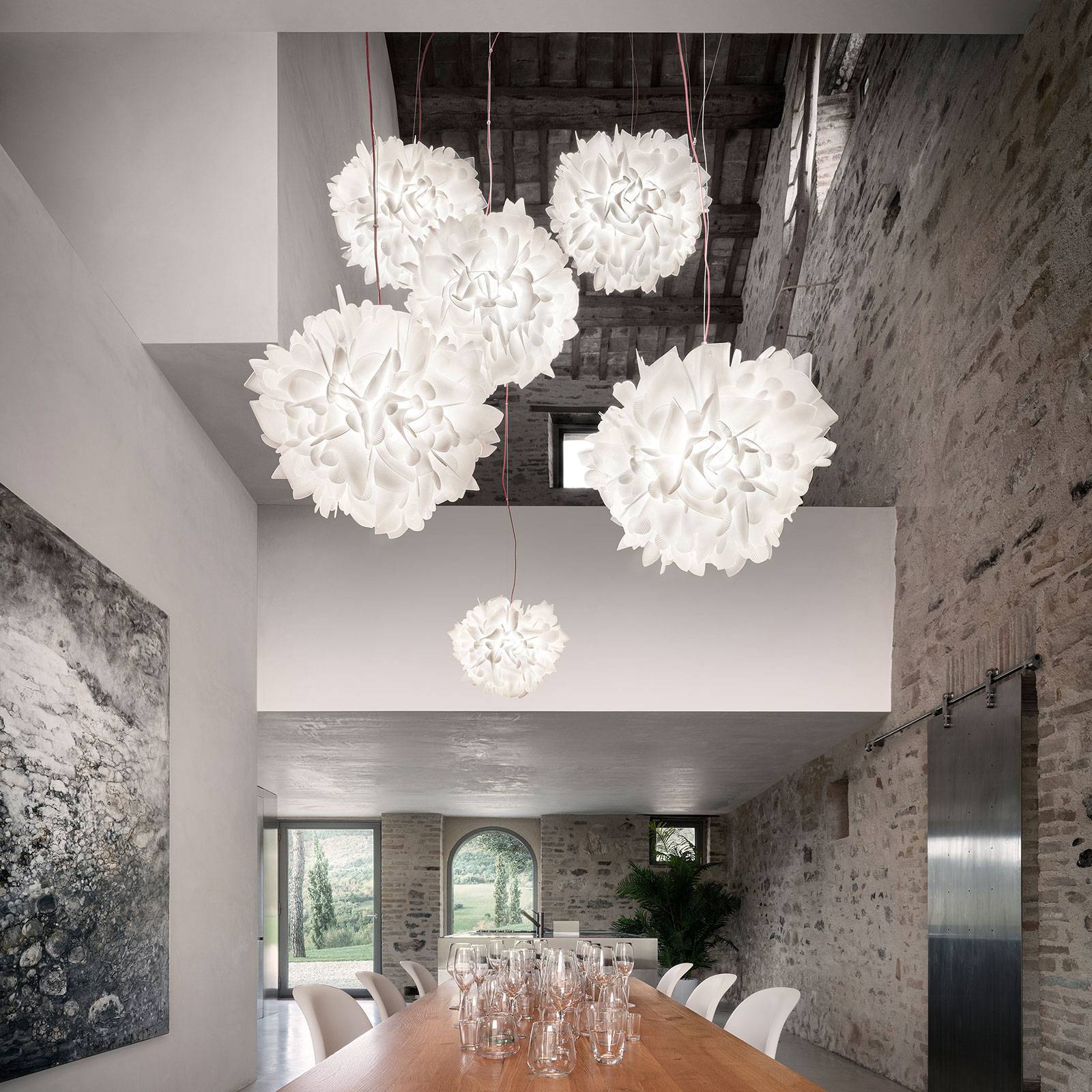 Elegante lampada a sospensione Veli fatta di elementi di fogliame bianco La lampada a sospensione Veli emana una sensazione di leggerezza e un certo lusso attraverso il suo look decorativo ed emozionante. Il design esclusivo e unico diventa immediatamente un eye-catcher. Una moltitudine di connettori in Opalflex® sono posizionati e piegati a mano per ottenere le forme affascinanti. La plastica, sviluppata e brevettata dallo stesso produttore italiano Slamp, è una combinazione di tecnopolimeri e cristalli di vetro che sono estremamente flessibili e completamente infrangibili. Il materiale ha eccellenti proprietà termiche, elettriche e chimiche e si dimostra particolarmente durevole. La superficie riccamente strutturata fornisce un'attraente diffusione della luce tutt'intorno. I singoli componenti rifrangono la luce e la dirigono in una direzione specifica a seconda del suo orientamento. Anche quando è spenta, la lampada a sospensione emana un'atmosfera di benessere con la leggerezza di una nuvola, con il risultato che può essere utilizzata in molte stanze e si integra perfettamente con gli stili di arredamento moderni. Il paralume in ottica bianca è armoniosamente completato da un cavo che lo collega al discreto baldacchino rotondo sul soffitto. Grazie a un pratico sistema magnetico, il paralume può essere rapidamente e facilmente rimosso dalla sospensione per la pulizia. Slamp è stata fondata nel 1992 da Roberto Ziliani e ha sede a Roma. La sostenibilità è un'alta priorità per il produttore di lampade di design, che si esprime nello sviluppo interno di materiali durevoli. Questo riduce i costi ambientali di un fattore quattro. Dal 2020, i residui della lavorazione non sono più solo riciclati, ma donati ad aziende che producono cassette di nidificazione per i bombi. Inoltre, i componenti delle luci sono fabbricati tramite taglio a freddo, che non produce emissioni di CO2.