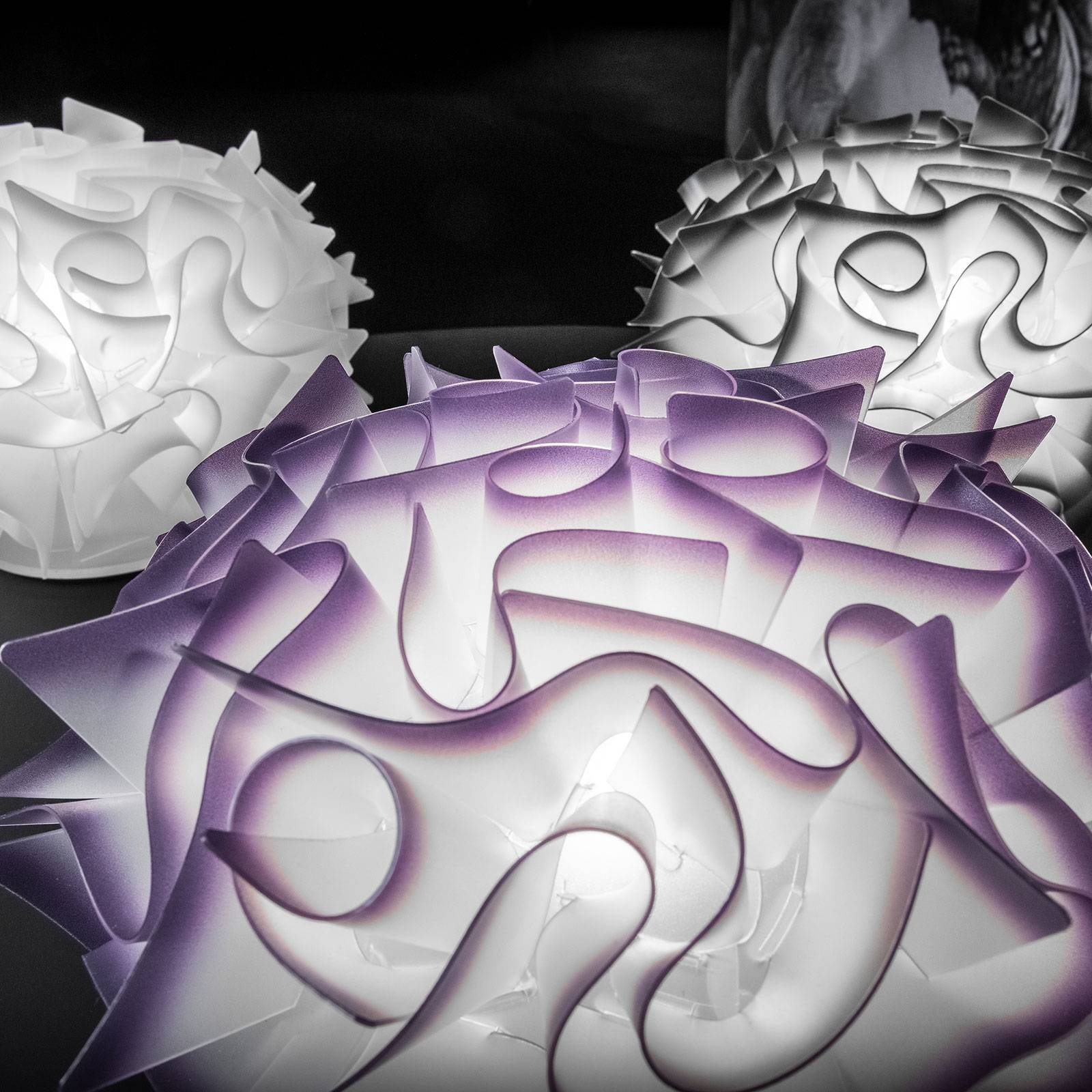 Lampada da tavolo ovale Veli in bianco opalino e antracite La lampada da tavolo Veli è un pezzo d'arte, dalla struttura accattivante, e si integra così in modo ideale in un'abitazione moderna. Grazie ai tanti modelli e alla limitazione dei colori al bianco e nero, è praticamente intramontabile e si adatta ovunque. La luce si distribuisce delicatamente in tutte le direzioni, ponendo un accento delicato, che non abbaglia. La lampada viene alimentata con un cavo trasparente. Si accende e spegne con un interruttore altrettanto trasparente. Entrambi sono praticamente poco visibili e quindi molto pratici, perché non guastano l'ensemble decorativo. La lampada da tavolo è montata su una base piccola, non visibile, costituita unicamente da una piastra circolare. Questa non sporge dal diametro del paralume, tanto da risultarne praticamente nascosta. Anche il paralume è bianco e ovale. Raggiunge un diametro massimo di 32 cm e misura 22 cm in altezza. Il materiale sembra essere composto da tante ruche in tessuto, i cui bordi color antracite sono rivolti verso l'esterno. Attraverso gli spazi intermedi, la luce si fa largo in modo da creare immagini accattivanti su parete e tavolo. Il materiale è stato inventato dalla squadra di designer di Slamp e si chiama Opalflex. È molto leggero (la lampada da tavolo totale Veli pesa solo 0,55 kg), durevole e perfetto per i paralumi. La lampada da tavolo Veli presenta la classe di isolamento II.