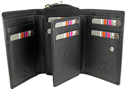 Bottone a pressione apertura a 2 sezioni per le note, 12 carte di credito con 3 ulteriori slot dietro, dimensioni approssimative: 13 cm l x 9 cm H x 3 cm D (chiuso e vuoto)