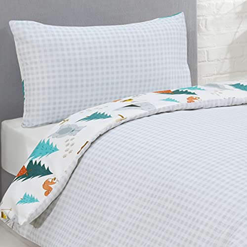 Sleepdown Set di Biancheria Copripiumino e federe, per Bambini, Motivo: Uccelli e Alberi, Colore: Bianco, Grigio, Reversibile, Morbido e Facile da Pulire, per Letto Singolo (135 x 200 cm), Poliestere