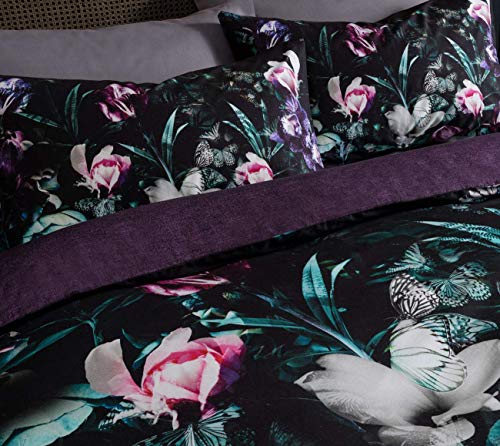 Sleepdown - Set da letto con copripiumino reversibile, motivo floreale, colore nero e viola, morbido e confortevole, in 100% cotone, con federe, misura matrimoniale, 200 cm x 200 cm
