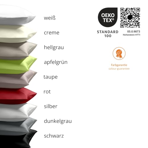 Confezione doppia di federe in 100% cotone a fili fini in qualità renforcé. Si distingue per una superficie liscia, morbida e piacevole al tatto e un'elevata assorbenza. Il materiale è adatto per le giornate calde e fredde ed è quindi un compagno ottimale per tutto l'anno