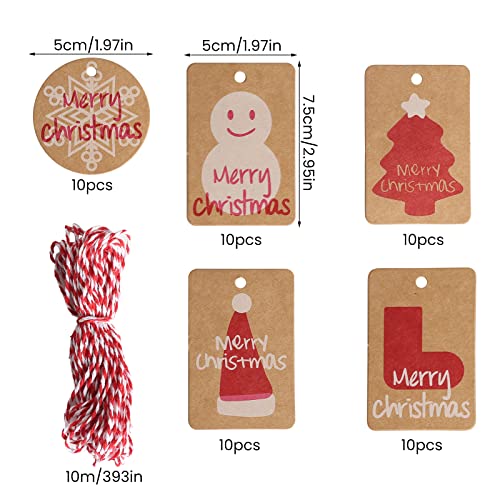 SLFYEE 50PCS Etichette Regalo Natalizie Kraft Tag regalo di Natale Bigliettini Natale con Corda Appesa 10m 5 Diversi Disegni Etichette Regalo di Carta per Natale Feste Mtrimonio DIY