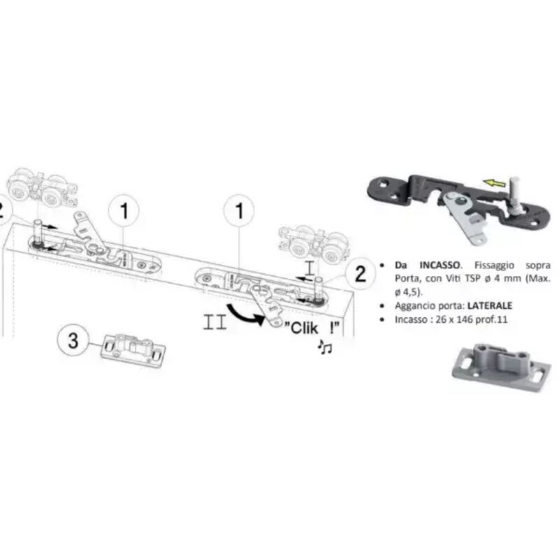 Coppia di staffe di sospensione, da incassare nella porta in legno con aggangio laterale. In dotazione ci sono anche n.2 viti speciali M8 antirotazione per l'aggancio laterale della porta e la guida inferiore in nylon antitremolio. Portata: fino a 200 Kg Compatibile con PUMA22040