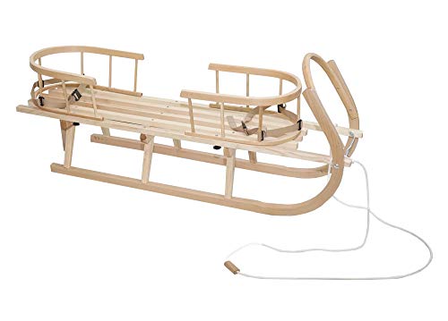 Slitta in legno di faggio, laccata naturale con guida di scorrimento in metallo con due schienali e corda. / Perfetto per bambini e adulti come slittino da downhill.