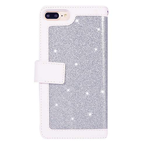 9 Slots per schede Portafoglio in Pelle Custodia Compatibile con iPhone 8 Plus iPhone 7 Plus Cover Brillantini Bling Glitters Cerniera Flip Wallet PU Chiusura Magnetica Zipper Case Argento
