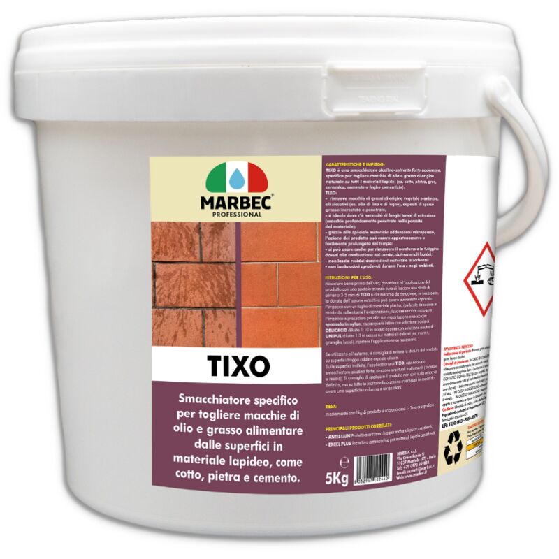 TIXO | Pulitore alcalino forte addensato, specifico per la rimozione da superfici in materiale lapideo di oli e grassi di alimenti animali o vegetali CARATTERISTCHE E IMPIEGO: TIXO è uno smacchiatore alcalino-solvente forte addensato, specifico per la rimozione di macchie di olio e grasso di origine naturale su tutti i materiali lapidei (es. cotto, pietra, gres, ceramica, cemento). TIXO: rimuove macchie di oli e grassi di origine vegetale o animale, oli siccativi (es. olio di lino e di legno), fuliggine e residui carboniosi (es. nerofumo), depositi di sporco grasso;