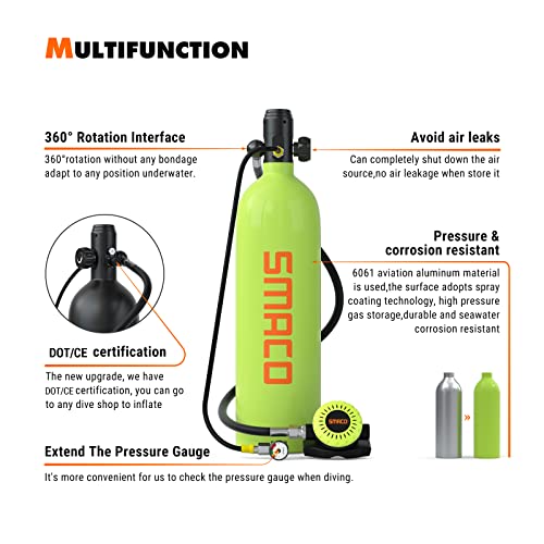 【AMPIA APPLICAZIONE】:Lo SMACO bombole aria sub è un sistema di immersione e snorkeling. Questo kit non solo può essere utilizzato come fonte d'aria ridondante, ma può servirti in diverse attività in acque poco profonde come immersioni ricreative, caccia al tesoro, aragoste, ispezione della barca, pulizia della barca, immersioni di salvataggio ad ingresso rapido, ispezioni in piscina e altro ancora.