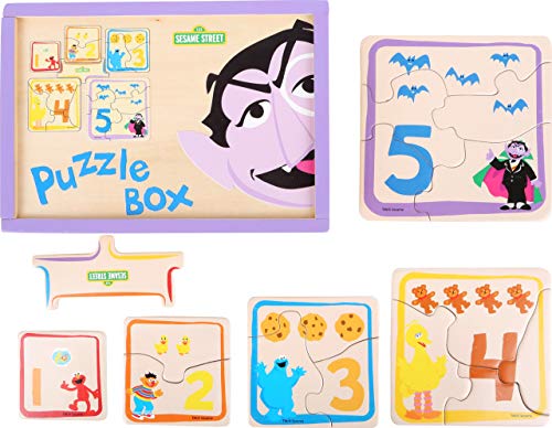 I cinque puzzle sono di diverse dimensioni e presentano le illustrazioni degli amati personaggi di Sesame Street quali Cookie Monster, Ernie, Elmo, Big Bird e Count von Count.