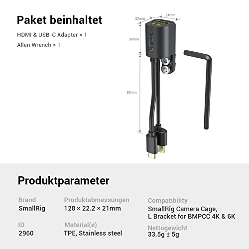 【Per BMPCC 4k/6k】 SmallRig 2960 HDMI e adattatore di tipo C per la gabbia della fotocamera BMPCC 4K e 6K è appositamente progettato per la gabbia della fotocamera SmallRig e la staffa L come 2203B, CVB2254, CVB2255, CVB2255B, LVB263 5, 276. 5.