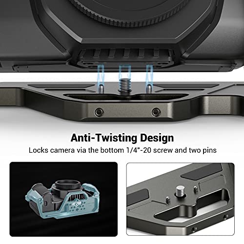【Abbinamento perfetto】La gabbia della fotocamera è fissata saldamente alla fotocamera tramite viti da 1/4"-20 sulla parte superiore e inferiore e incorpora perni di posizionamento e cuscinetti in gomma per una perfetta aderenza alla fotocamera.
