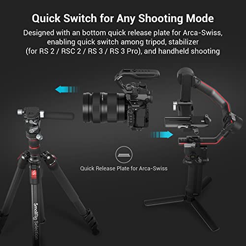 Piastra a Sgancio Rapido per DJI RS 3 / RS 3 Pro/RS2/RSC 2: La piastra a sgancio rapido per Arca sul fondo della gabbia è progettata per DJI RS 3 / RS 3 Pro/RS 2/RSC 2, che consente il passaggio rapido tra treppiede, stabilizzatore (per DJI RS 3 / RS 3 Pro/RS 2/RSC 2) e tiro a mano libera. Inoltre, i fori filettati da 1/4" consentono il trasferimento alla piastra a sgancio rapido SMALLRIG per Arca 3154.