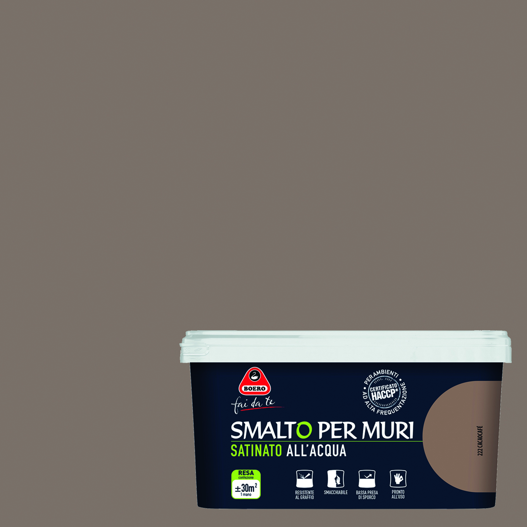 Smalto per muri satinato all'acqua, inodore, caratterizzato da un'ottima resistenza al lavaggio e a piccoli graffi. È antisporco, facilmente smacchiabile e garantisce elevata protezione e igiene prolungata anche in ambienti molto frequentati ed esposti a deterioramento o usura come scuole, ospedali, alberghi, bar, ristoranti uffici, etc. Certificato HACCP.. Ideale in ambienti molto frequentati ed esposti a deterioramento o usura come scuole, ospedali, alberghi, bar, ristoranti uffici. Certificato HACCP. Un colore avvolgente e adatto per le stanze in cui ci si riunisce. Ogni nuance di marrone crea subito un effetto di accoglienza e familiarità. Lavabile e smacchiabile con una spugna umida senza rimuovere pittura. Si possono utilizzare dove sono presenti alimenti perché certificato HACCP
