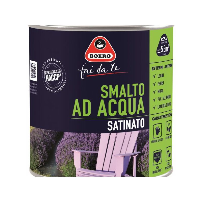 BOERO - SMALTO SATINATO AD ACQUA CORALLO 0,500LT Smalto inodore con certificazione HACCP Facile da applicare in quanto non gocciola, non cola ed è pronto all'uso. È adatto ad ogni tipo di supporto (in ferro, legno, muro, fibrocemento, PVC, lamiera zincata, ecc.), sia interno che esterno, e particolarmente indicato per ambienti abitati in quanto inodore e a rapida essicazione: può essere utilizzato per la verniciatura di ambienti con presenza di alimenti (secondo la norma UNI 11021-2002 relativa alla metodologia HACCP). CARATTERISTICHE TECNICHE FORMATO RESA CONFEZIONE (PER MANO) RESA PER LITRO DILUIZIONE 0.125 1.25-1.38 mq 10-11 mq Pronto all'uso. Se necessario, aggiungere il 2-5% di acqua potabile. 0.5 5-5.5 mq 10-11 mq Pronto all'uso. Se necessario, aggiungere il 2-5% di acqua potabile. 2 20-22 mq 10-11 mq Pronto all'uso. Se necessario, aggiungere il 2-5% di acqua potabile.
