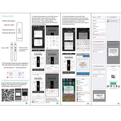 Facile da usare e pratico per portatile - 1, connet il traduttore e il cellulare tramite bluetooth.2, installazione itranslator app per il vostro telefono 3, immettere app per farlo funzionare, per ulteriori informazioni, si prega di fare riferimento al mannul. Piccolo design portatile, facile da trasportare. Batteria ricaricabile 600 mAh, super lungo lavoro globale tempo. lo strumento ideale per l' apprendimento delle lingue, viaggi, shopping all' estero, Business traduzione ecc.