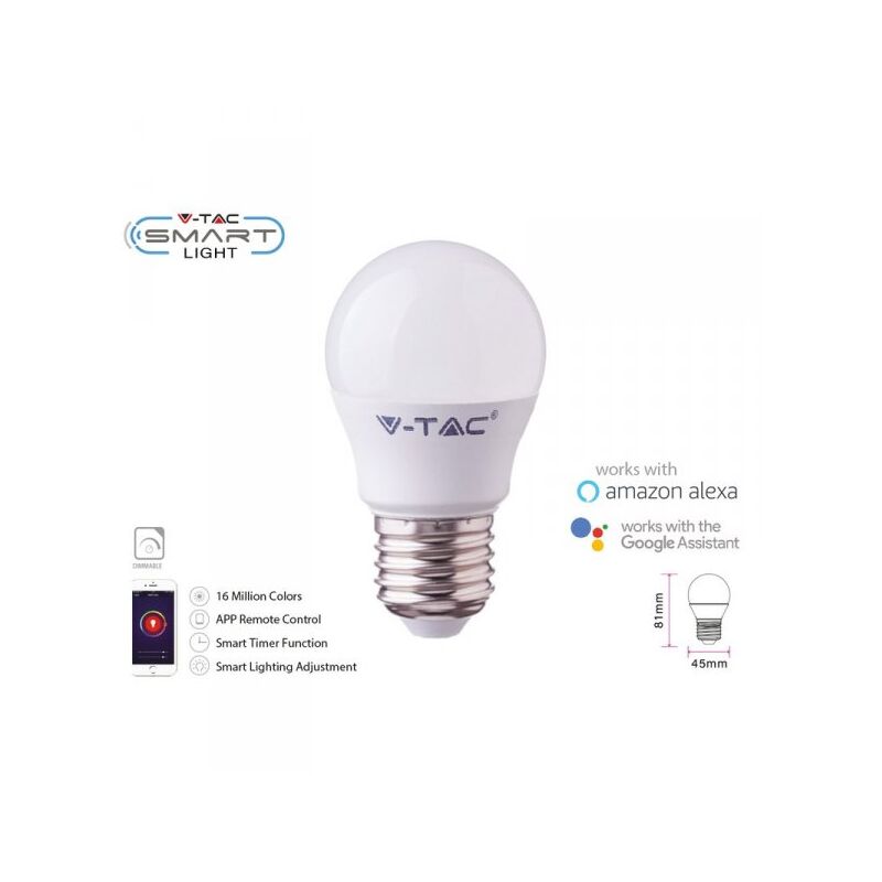 Lampadina termoplastica V-TAC Smart E27 G45 4,5W progettata con WiFi 2.4GHz Controlla la luce con l'app V-TAC Smart Light Smart Life TUYA(Offre molteplici funzioni - Cambio colore, Dim, On/Off) Standard wireless IEEE 802.11 b / g / n,Ciclo di commutazione di 20.000 volte Compatibile con Amazon Alexa e Google Home(Per Skill ALEXA Cerca prima SMART LIFT e poi Sceglie V-TAC Smart Light ) Applicazioni: perfetto per ambienti residenziali, commerciali, alberghi e molte altre applicazioni Marca V-TAC SKU SH02755 Dimmerabile SI (Tramite APP) Attacco E27 G45 Voltaggio AC220-240V 50Hz Potenza 4,5W Luminosità Circa 300 Lumen Totale CRI RA>80 Angolo Luce 180 Gradi Colore RGB+CCT (2700-6400K) Impermeabilità IP20 Temperatura Emesso < 50°C Dimensione Diametro 45mm, Altezza Totale 81mm Durata 30000 ore Compatibile Amazon Alexa e Google Home APP V-TAC Smart Light Smart Life TUYA Omologazione SI, CE e RoHS Nota Bene Adatto e consigliato per un uso quotidiano massimo di 10-12 ore,L'utilizzo oltre questo