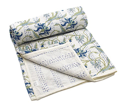 Smartbuyz SB, copriletto estivo etnico in tessuto indiano kantha trapuntato, reversibile, King Size, bianco con motivo floreale stampato;