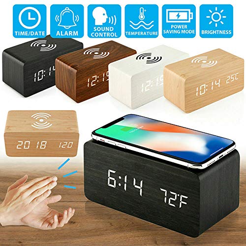 SmartHitech Sveglie Digitale Mutifuctional - Sveglia da Scrivania a LED in Legno USB/a Batteria | Controllo Vocale e Ricarica Wireless | Mostra Ora, Data e Temperatura (Bianco)