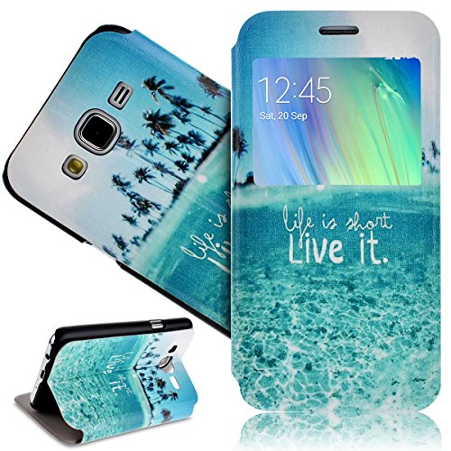 SMARTLEGEND Cover per Samsung Galaxy J5 5 Zoll (2015) Smart Window View Touch Custodia in Pelle Flip Protettiva Cover Case Blu Mare e Albero Pattern - La vita è breve