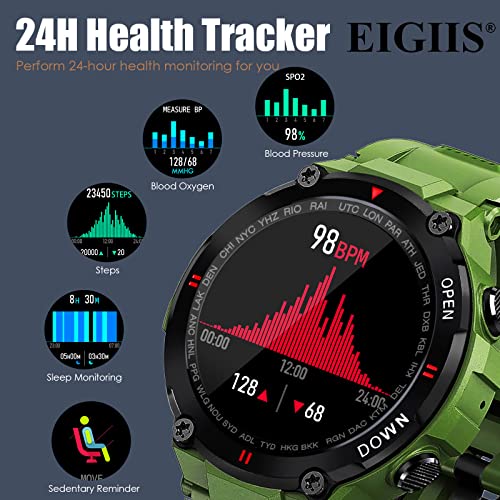 【Monitoraggio dell'attività di precisione】 L'orologio sportivo militare EIGIIS contiene 7 modalità di sport professionali, come camminare, corsa, ciclismo, badminton, ecc. Durante l'esercizio, registra con precisione il tuo stato di esercizio, traccia il numero di passi, le calorie bruciate, la distanza percorsa, ecc. Inoltre, dopo una connessione riuscita con il telefono, puoi vedere la traiettoria del tuo movimento GPS sull'APP accoppiato (Dafit).