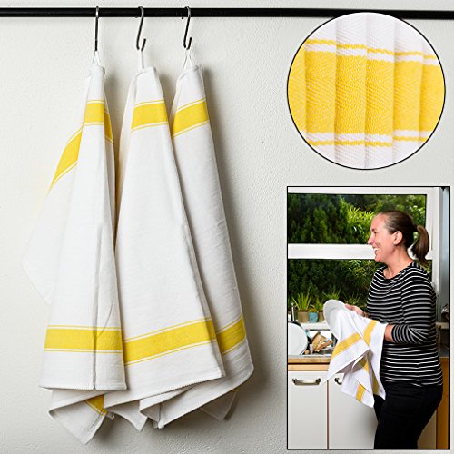 SMARTZ Strofinacci-Confezione da 12 pezzi, Asciugamani da tè con passante (100% cotone grande 70X50 cm) - Più lunga durata, super assorbente in bianco con strisce gialle - Design esclusivo a spina di pesce per asciugatura rapida e bassa lanugine - Il miglior tè / asciugamani per la tua cucina Garantito