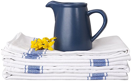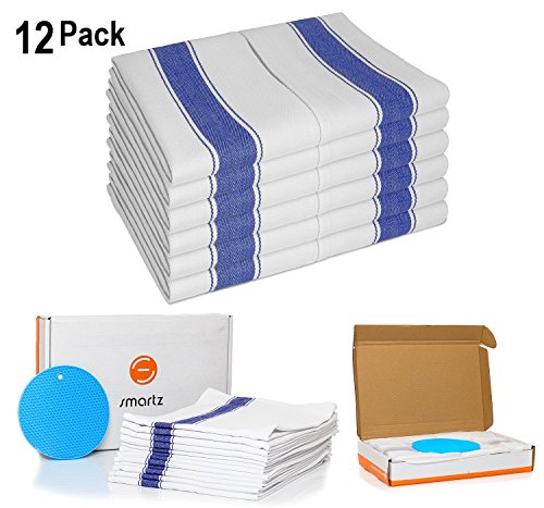 SMARTZ Strofinacci-Confezione da 12 pezzi, Asciugamani da tè con passante (100% cotone grande 70X50 cm) - Più lunga durata, super assorbente in bianco con strisce blu - Design esclusivo a spina di pesce per asciugatura rapida e bassa lanugine - Il miglior tè / asciugamani per la tua cucina Garantito