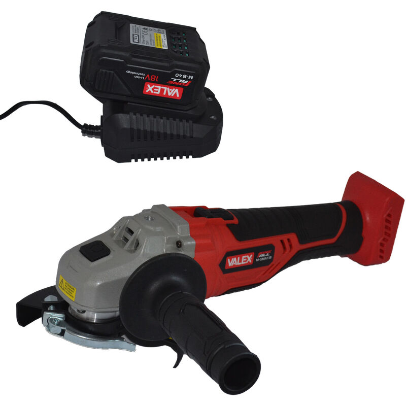 Kit smerigliatrice - Marca Valex - Modello Oneall - Smerigliatrice angolare con caricabatteria - Diametro disco 125 mm - Impugnatura gommata - Batteria 4 Ah - Diametro disco 125 mm Kit smerigliatrice a batteria Valex 4 Ah Oneall angolare flex completa di batteria 18 V e caricabatteria, con pulsante blocca disco, partenza progressiva ed interruttore di sicurezza contro l'accensione accidentale. Giri/min 8500. Protezione disco regolabile senza utensile, impugnatura anteriore gommata fissabile in 3 posizioni. Diamtero disco 125 mm.