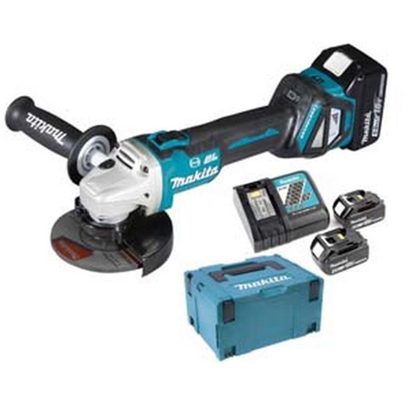 18v di potenza - disco ? mm.125/115 - 2 batterie da 5,0ah - caricabatterie - tempo di carica 45 minuti - velocit? a vuoto 3000/8500 g/min. - motore brushless - freno motore - interruttore a slitta - blocco accensione - funzione antiriavvio - indicatore
