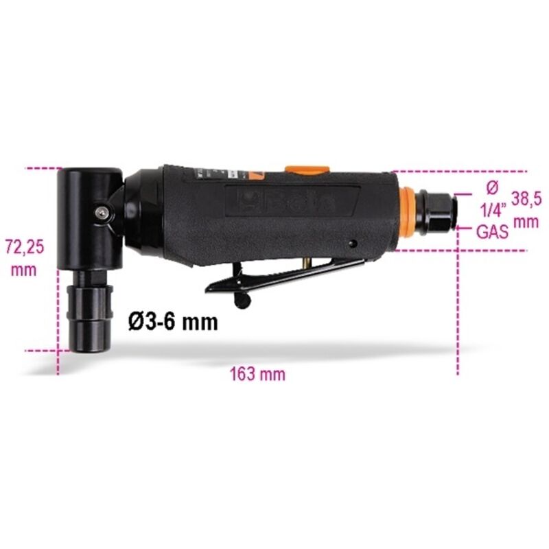 Smerigliatrice angolare. la testa a 90 e l'albero montato su cuscinetti a sfera permettono di lavorare accuratamente in aree ristrette corpo ed impugnatura in materiale antiscivolo montata su cuscinetti a sfera regolatore di velocit mediante manopola attacco aria girevole scarico dell'aria posteriore silenziato leva di sicurezza a scatto fornita con pinza da 3 e 6 mm Tipologia: Smerigliatrice angolare Velocità libera: 20000 giri/min Capacità pinza: 3-6 mm Potenza: 0,20 kw Attacco Aria: 1/4 gas Pressione di utilizzo: 6,2 bar Diametro interno tubo aria: 10 mm Consumo aria medio: 230 l/min Peso: 510 g