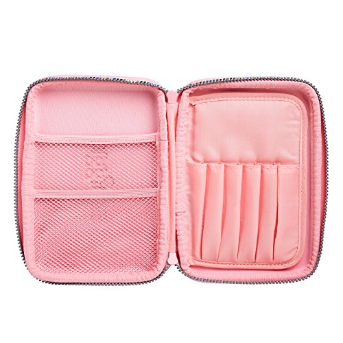 Chiusura a lampo colore arcobaleno e astuccio rosa pastello con scomparto interno in rete e porta-penne.