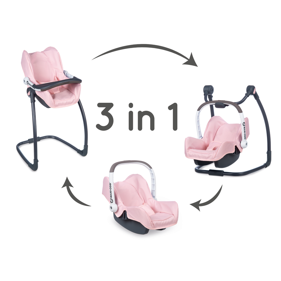 Il sorprendente seggiolone multifunzionale 3 in 1 Maxi Cosi per la tua bambola preferita! Questo seggiolone ha tutto, perché può essere usato in tre modi diversi. Si trasforma facilmente in un dondolo o diventa un vero e proprio seggiolino Maxi Cosi! Il rivestimento in tessuto grigio può essere pulito accuratamente con una spugna umida. Adatto a bambole fino a 42 cm (bambola non inclusa). Dettagli del prodotto: Dimensioni (lunghezza x larghezza x altezza): 45 x 41 x 71 cm Con stabile telaio in metallo Robusto vassoio in plastica Maniglia di trasporto regolabile Cintura di sicurezza e vano portaoggetti sul retro Adatto a tutte le bambole fino a 42 cm Fornito senza bambola Età: da 3 anni Attenzione Non adatto ai bambini sotto i 3 anni. Pericolo di soffocamento a causa delle piccole parti. Bambola non inclusa. A proposito di Smoby: Uno dei più noti produttori di giocattoli francesi, Smoby Toys sa cosa rende felici i bambini e soddisfatti i genitori: giocattoli innovativi che aiutano i piccoli a scoprire e ad allenare le proprie abilità, allegramente colorati e pieni di idee. Perché i bambini sono nati esploratori! Comprendono e sperimentano il mondo attraverso il gioco e le prove. Ecco perché i giocattoli sicuri e adatti all'età sono così importanti. Smoby Toys è un esperto in giocattoli testati basati sulle ultime ricerche educative. Ma la cosa più importante è: giocare con i prodotti Smoby è super divertente!