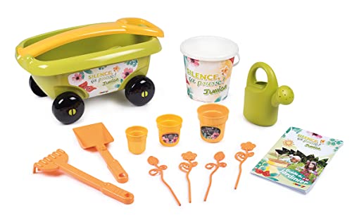La nostra gamma "Silence, ça Push". Junior" si rivolge ai vostri bambini fin dalla loro età più giovane per iniziarli con i loro genitori e/o nonni (piantaggio, rinvaso, ciclo di vita di una pianta, ecc.). Con il carrello a rotelle dai colori dell'emissione il vostro bambino potrà piantare ciò che vuole all'interno, utilizzarlo per trasportare i suoi vasi o trasportare la terra. 3 vasetti di diverse dimensioni (piccolo, medio, grande), 1 annaffiatoio, 1 doppio (pala e rastrello), 4 supporti e 1 libretto esplicativo sono inclusi.