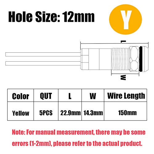 Smseace 5PCS Giallo DC/AC12V-24V Risparmio energetico 1/2'' Foro di montaggio della spia LED 12mm con cavo da 150 mm Lunghezza metallo Impermeabile LED Indicatore DQ-12-Y-12