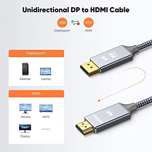 Snowkids Cavo DisplayPort a HDMI 1.4-3m 4K Ultra HD maschio Adattatore Display Port a HDMI-nylon intrecciato non bidirezionale DP to HDMI Ports Cavo Supporto Dell, Lenovo,HP (Grigio-3M)