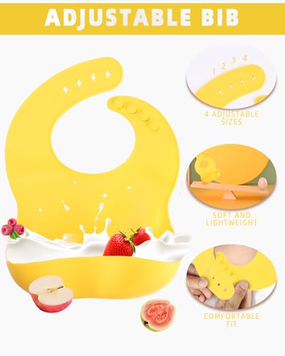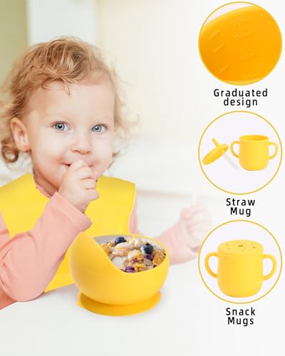SOBEAU Piatti per bambini, set di posate per bambini da 10 pezzi, ciotola, bavaglino, cucchiaio, forchetta, tazza per bambini 2 in 1, tazza per merenda, tettarella per frutta (Giallo chiaro)
