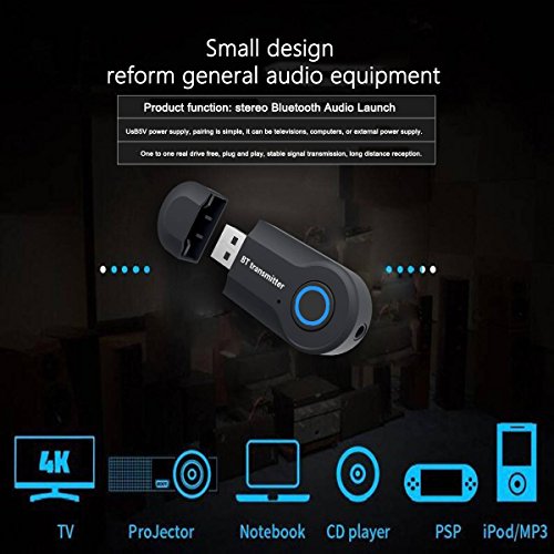 Il trasmettitore Bluetooth e' appositamente progettato per i dispositivi audio (come MP3, MP4, TV, PC e DVD, ecc.) Senza la funzione Bluetooth. Dopo aver effettuato il collegamento con un cavo audio da 3,5 mm o un cavo RCA, e' in grado di trasmettere i file audio degli stessi ai dispositivi Ricevitore abilitati Bluetooth (come Cuffie, Altoparlanti, Ricevitore Bluetooth, ecc.).
