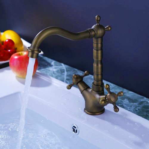 SODIAL(R) Rubinetto cucina lavabo in ottone antico con due maniglie con beccuccio girevole