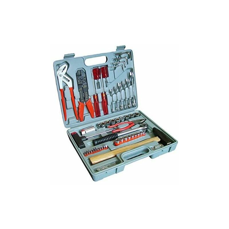 Set attrezzi in comoda valigetta composto da: - 8 chiavi 1/2'' mm. 10/1 - 9 chiavi 1/4'' mm. 5/13 - 1 chiave per candele - 1 cricchetto - 6 chiavi combinate mm. 8/17 - 1 pinza regolabile - 1 pinza capicorda - 4 chiavi esagonali - 1 pinza universale - 1 martello - 4 cacciaviti - 1 cacciavite ''T'' - 1 adattatore bits - 1 spessimetro - 11 bits mm. 25 - 49 terminali assortiti