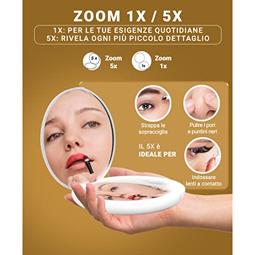 【Ingrandimento Ideale-1xRealistico e HD 5x Non distorsa】Lato normale 1x per soddisfare tutte le esigenze quotidiane e 5X può ingrandire le caratteristiche del tuo viso, aiutandoti a vedere chiaramente le tue caratteristiche del viso e i più piccoli dettagli. Questo specchio è particolarmente adatto per il trucco degli occhi, come eyeliner, sopracciglia o dopo trucchi. Meno ricarica, migliore qualità. È piccolo e facile da trasportare