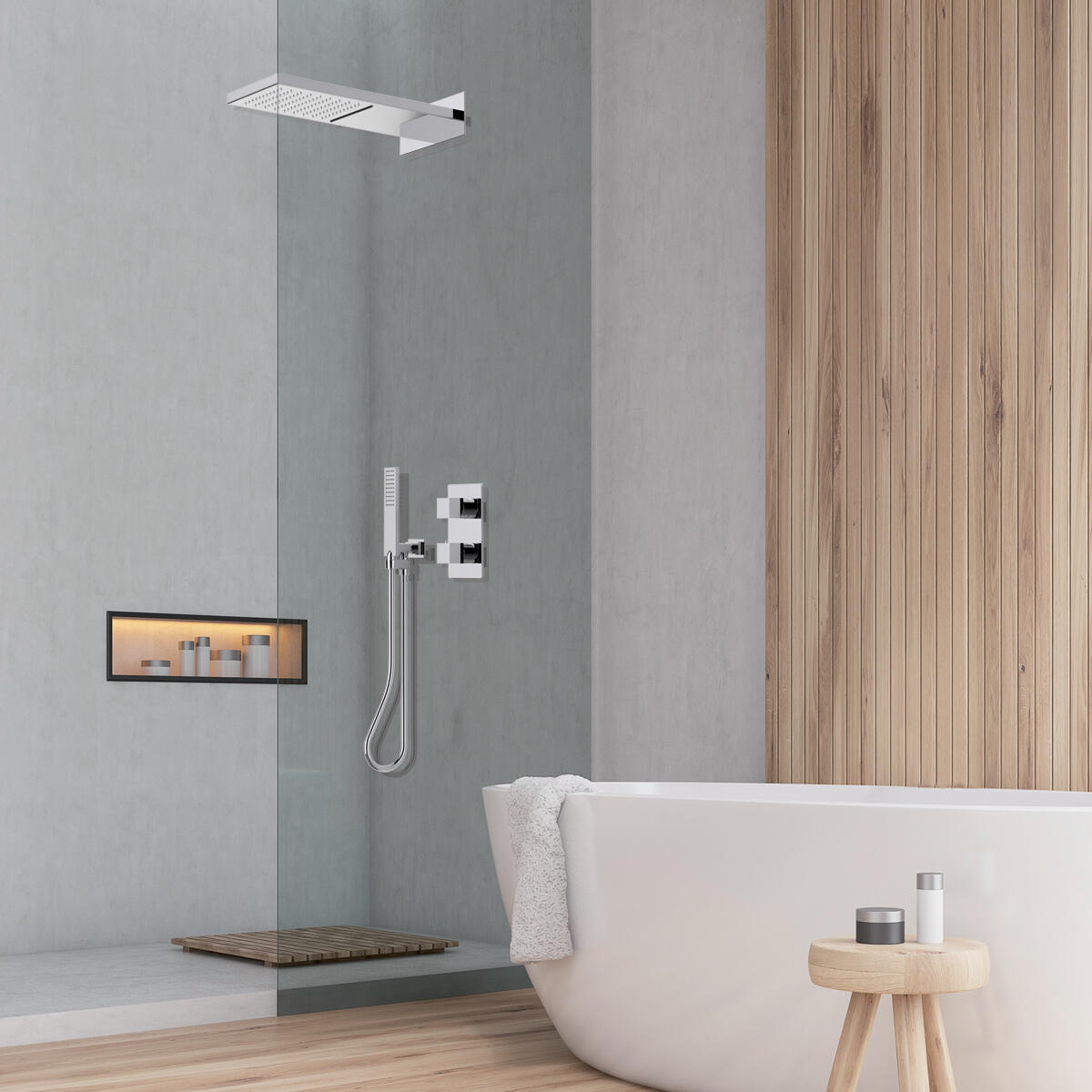 Soffione in acciaio inox a 2 getti, pioggia e cascata, con sistema easy clean per gli ugelli del getto pioggia, colore grigio/argento.. Facile pulizia.