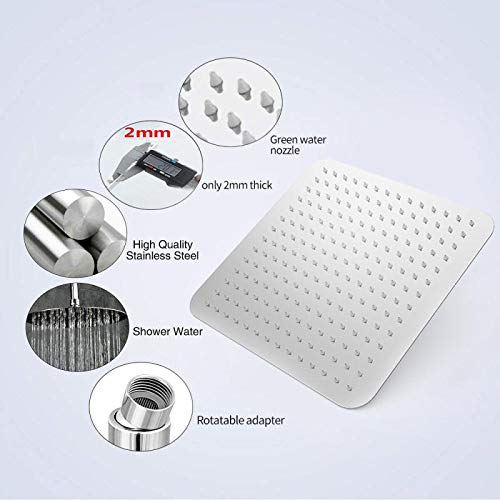 Acciaio inossidabile 304, effetto specchio lucido, ugelli anticalcare e design ultra piatto (2 mm), soffione doccia a pioggia quadrato.
