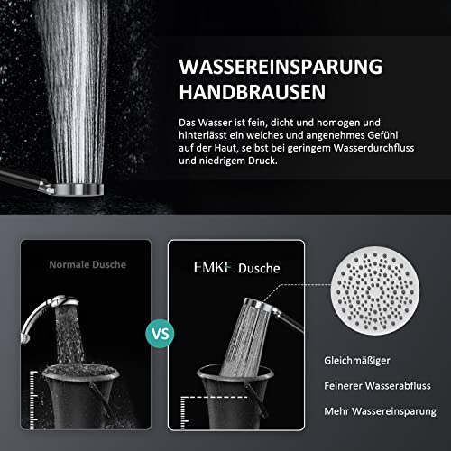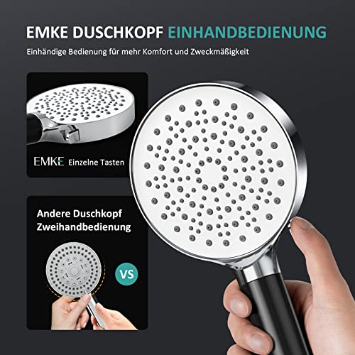 Soffione doccia grande: il soffione doccia rotondo Emke ha un diametro di 12 cm e offre quindi una zona doccia più ampia rispetto ai tradizionali soffioni doccia e con il suo flusso d'acqua uniforme garantisce un'esperienza doccia più confortevole. Il soffione doccia Emke è dotato di ugelli in silicone che impediscono efficacemente l'intasamento causato da depositi di calcare e possono essere rimossi con un panno delicato, rendendo la pulizia facile e comoda e risparmia tempo.