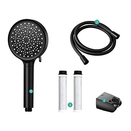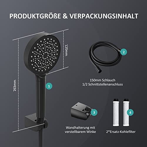 Set doccetta EMKE con tubo flessibile in PVC nero da 1,5 m, 1 supporto da parete nero con angolo regolabile e 2 filtri in fibra di carbonio di ricambio (uno preinstallato nella doccia)