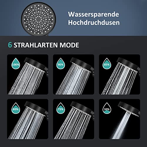 EMKE Soffione doccia a risparmio idrico con tubo, aumento della pressione, a risparmio d'acqua con filtro, doccetta con 6 tipi di getto, nero opaco
