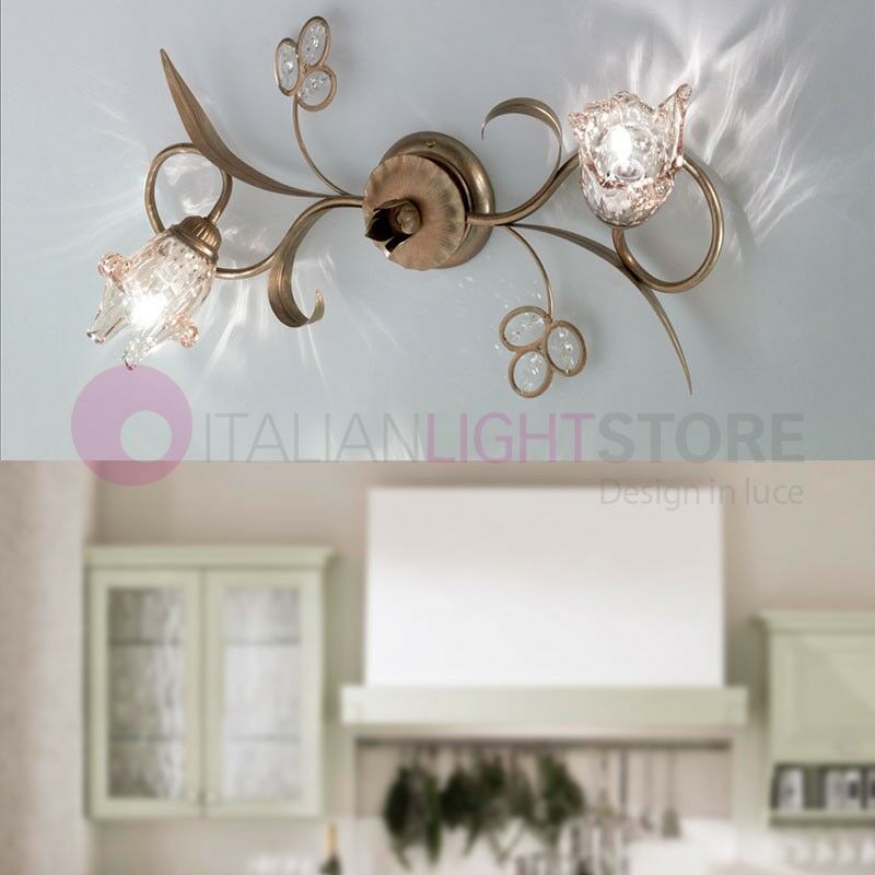 Plafoniera a soffitto e a parete in stile classico a 2 luci, finitura oro francese, ideale per illuminare zone pranzo e camere da letto. Lampada a Parete e Soffitto Plafoniera a 2 Luci con struttura in metallo finitura oro francese (vernice oro opaco sfumato oro più chiaro) arricchita da foglie in metallo sagomato e perline in cristallo trasparente;